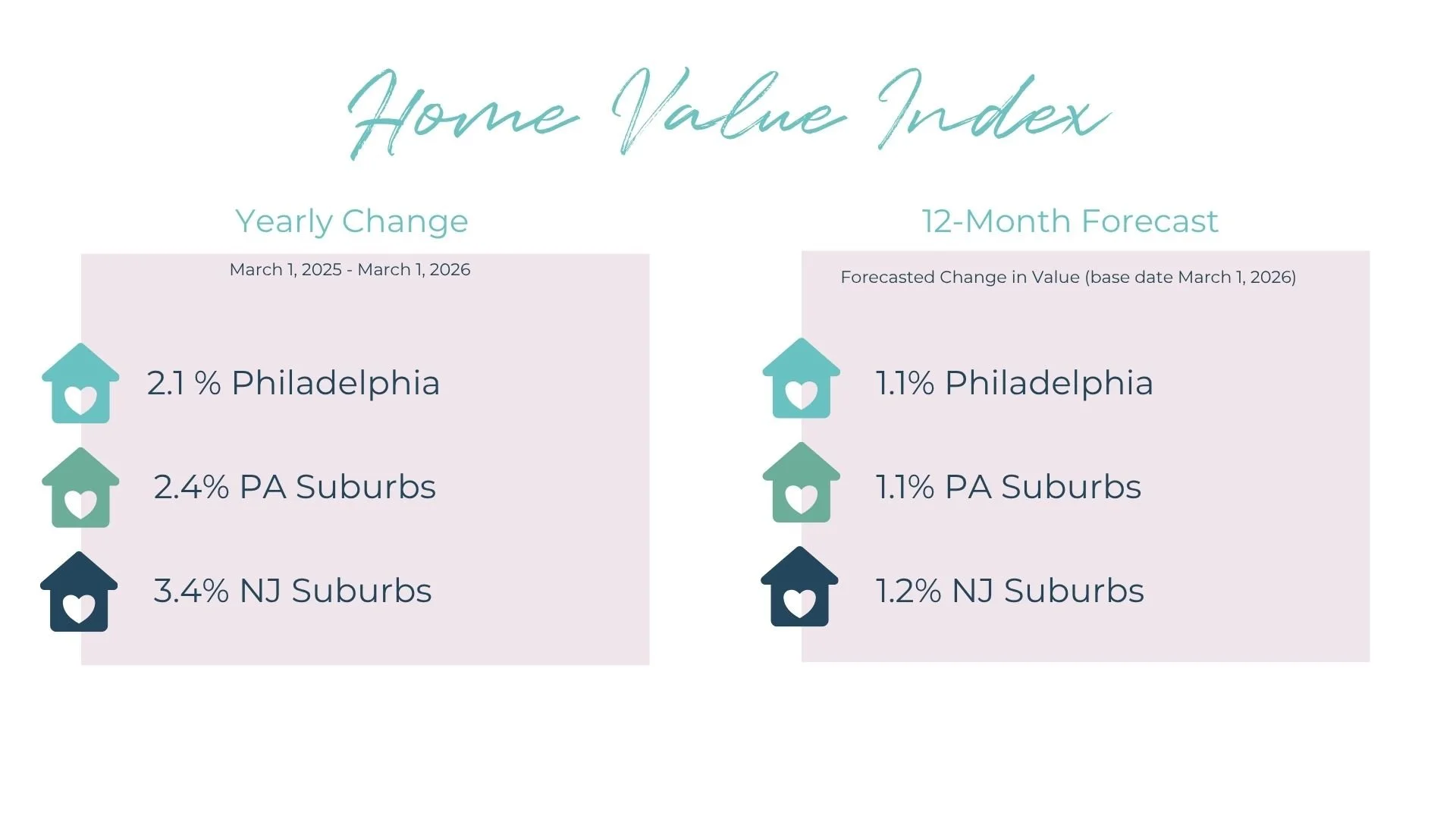 In all the surrounding PA counties, the change since last year increased: Bucks +4.2%, Chester +4.4% , Delaware +2.1%, Montgomery +2.8%, bringing the home value indexes to Bucks $507,666, Chester $561,125, Delaware $359,086, Montgomery $481,492.*